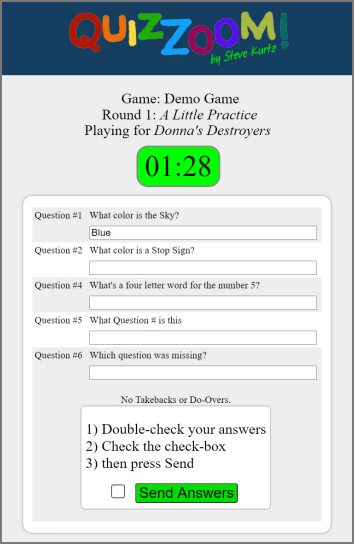 QuizZoom! was created as a tool for use with Zoom (and other Video Conferencing software like MS Teams, Skype, and Discord) to facilitate online Trivia Contests. It provides a simple and uniform way for participants to receive and answer Rounds of Questions, and for the Quizmaster to Score each Team's Answers. Team Members work together and are able to see Answers by other Teammates in real time, even if in different locations.